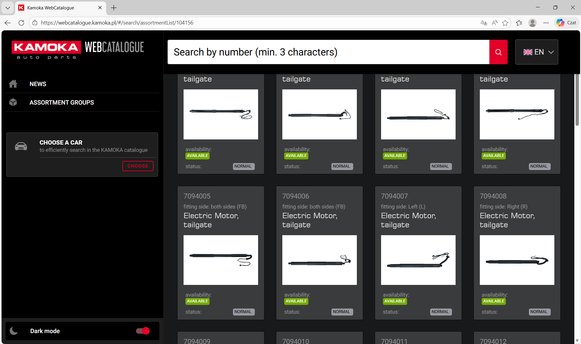 - Status and availability – The application will indicate whether a given part is available, but will not provide detailed information about the number of items available. The number of available products can be checked after logging into the KAMOKA Orders application, which is available to the brand's customers.