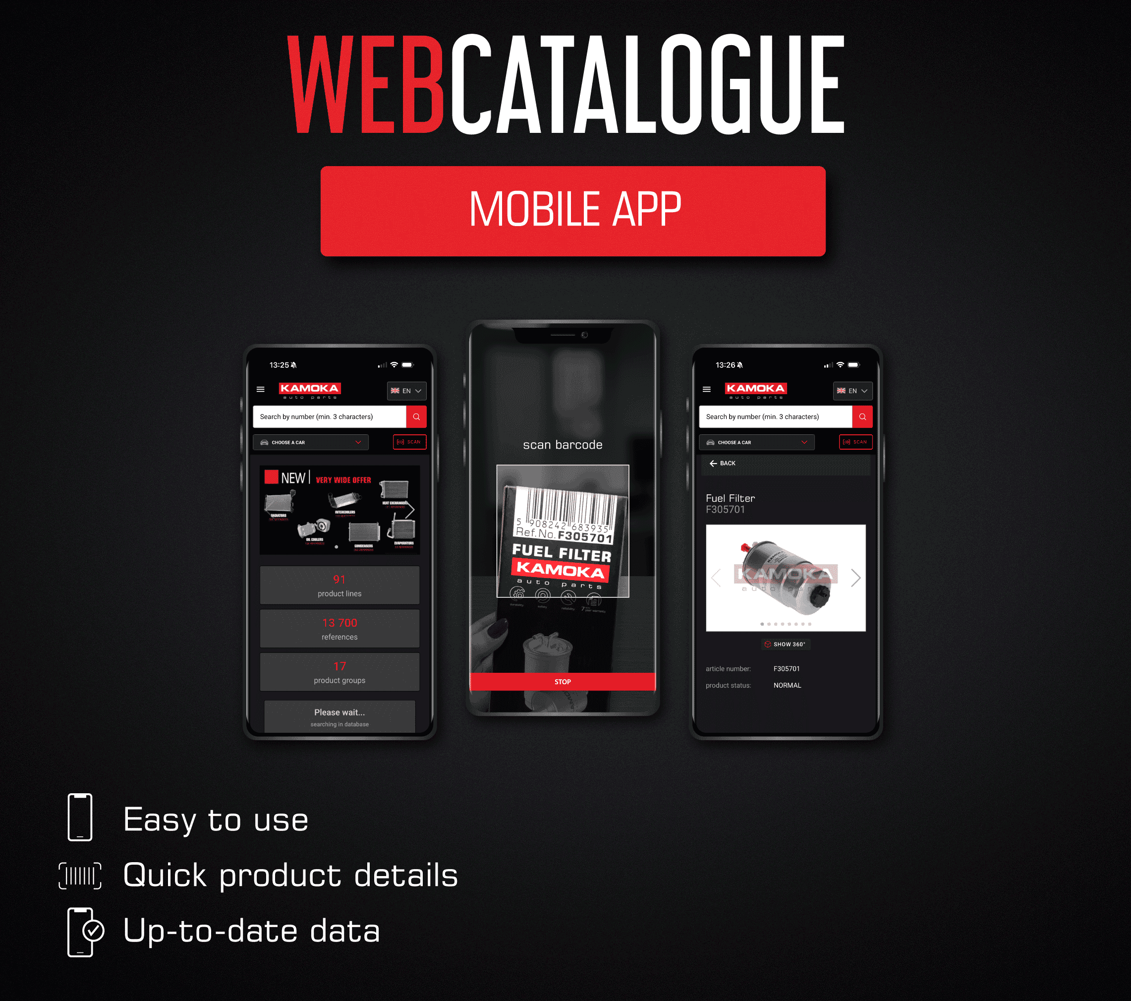 It is the perfect solution for mechanics and workshop employees who need information here and now, often directly at the car. With the app installed on your smartphone, you always have the catalog with you – in the workshop, in the parts warehouse, or when visiting a customer. Thanks to the barcode scanning function, the mobile version wins in terms of speed of service: it only takes a moment to scan the code from the box and display the product card. The mobile app works online, using the current KAMOKA database, so the user can be sure that the information about the parts is updated on an ongoing basis.